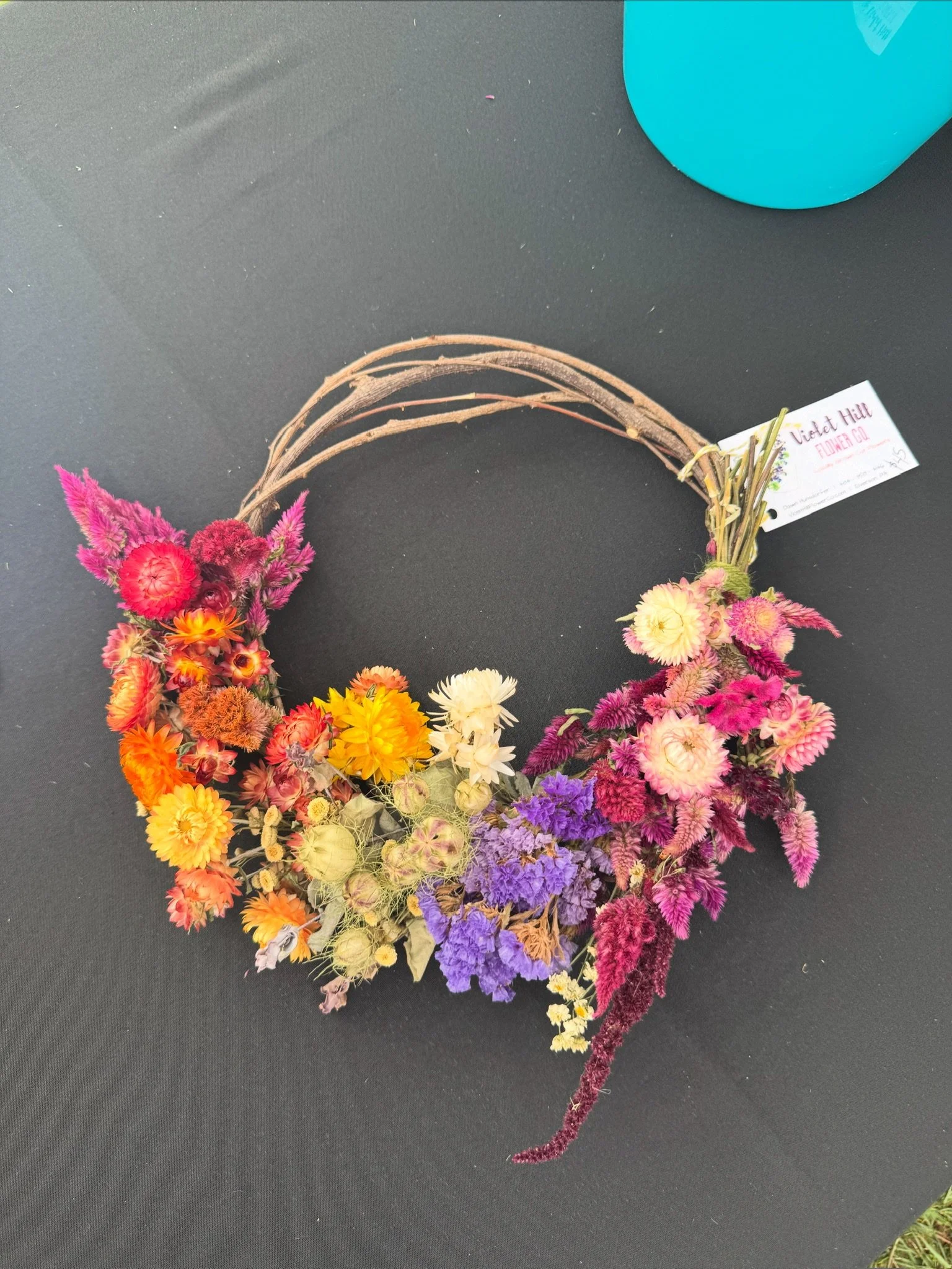 Freshly harvested, locally grown flowers that are in season in the form of market bouquets, deluxe large bouquets, and jar arrangements. Home decor wreaths will often accompany me as I have time to create them!